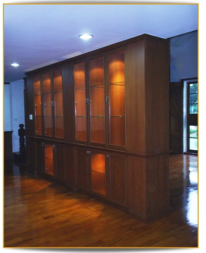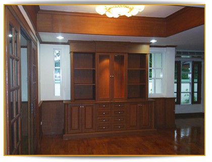 ตู้ไม้จริง สีเนื้อไม้ ออกแบบงานสไตล์ คลาสสิค เน้นโทนสีเข้ม เน้นพื้นที่ประโยชน์ใช้สอยสูงสุด